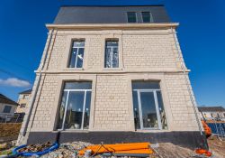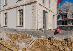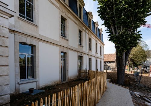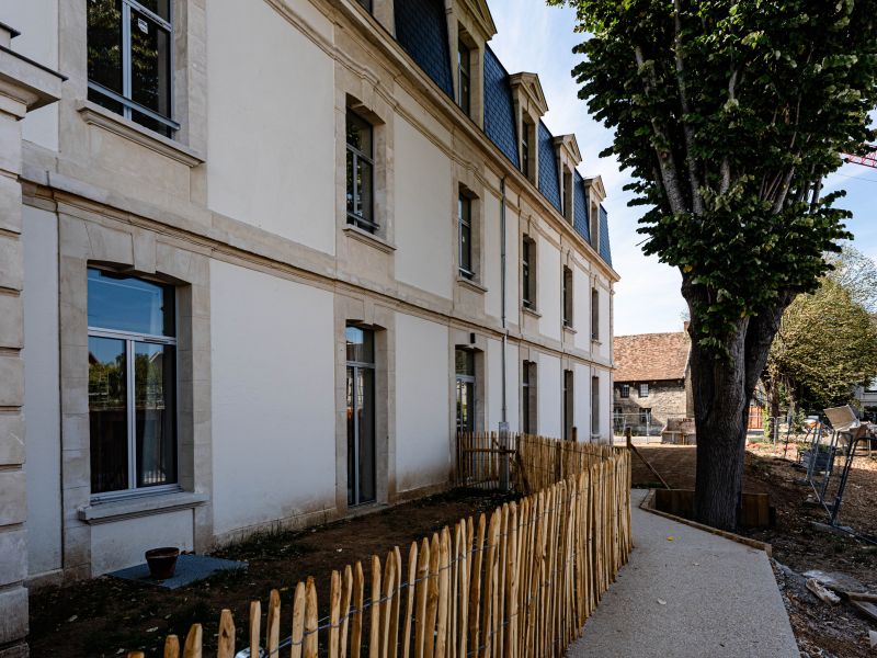 la réhabilitation de cette résidence prévoit la conservation des façades existantes : enduits rénovés et menuiseries entourées de pierres de caen. afin de permettre aux habitants de profiter d'une relation privilégiée aux jardins et aménagements paysagers depuis les séjours, certaines ouvertures sur allèges seront transformées en portes fenêtres. plusieurs logements au rez-de-chaussée disposent d'extérieur généreux, orientés vers l'ouest et l'est. les plantations de haies fruitières délimiteront les différents types de jardins, afin de permettre de profiter pleinement des extérieurs, à l'abri des regards.