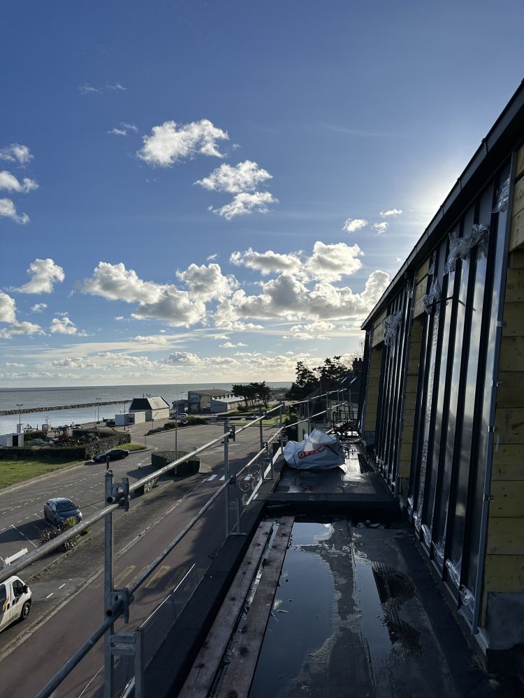 telle a été la devise de la conception de la résidence « HORIZON ».À la fois nichée contre une colline verdoyante et profitant d’une vue mer, la résidence Horizon propose des lignes épurées et contemporaines afin de s’intégrer de façon sensible dans ce contexte paysager. Au travers de cette architecture de lignes et de contrastes de couleurs, nous avons aussi souhaité lui donner un caractère maritime avec l’évocation d’un « paquebot de croisière » qui incite à l’évasion et au dépaysement. Les espaces extérieurs, tel un pont de bateau, sont généreux et offriront un cadre privilégié aux futurs résidents afin d’apprécier l’environnement naturel du Port de Carteret.
